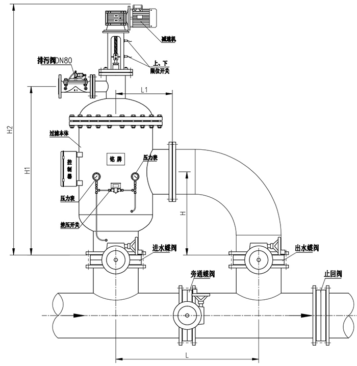污水在排污時(shí)通過排污口排出,壓差開關(guān)持續(xù)檢測濾網(wǎng)內(nèi)外的壓差,當(dāng)達(dá)到預(yù)設(shè)值時(shí)將傳遞一個(gè)開關(guān)信號到控制箱啟動一次清洗循環(huán)。
