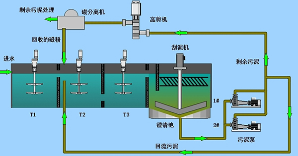 所謂磁混凝沉淀技術(shù),就是在普通的混凝沉淀工藝中同步加入磁粉,使之與污染物絮凝結(jié)合成一體,以加強(qiáng)混凝、絮凝的效果,從而達(dá)到絮凝體高速沉降的目的。整個(gè)系統(tǒng)由反應(yīng)池、沉淀池、污泥系統(tǒng)、磁粉回收系統(tǒng)、混凝加藥系統(tǒng)、PAM加藥系統(tǒng)、電氣控制系統(tǒng)等組成。該技術(shù)大大強(qiáng)化了對水中懸浮污染物的絮凝結(jié)合能力,減少絮凝劑用量,增大了磁回收率,特別適合含磷污水的去除。目前廣泛應(yīng)用于水處理工藝的預(yù)處理段、市政污水處理一級A提標(biāo)排放及黑臭水體的點(diǎn)污染源處理和應(yīng)急快速治理。