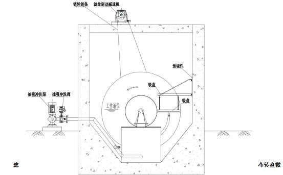 3、濾盤抽吸反洗機構 :由反洗吸盤、管道、反洗吸盤支架部件等組成。用于濾布的抽吸清洗。