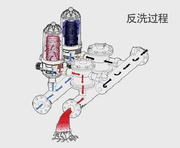 當(dāng)達(dá)到一定的壓差時(shí),或設(shè)定的時(shí)間內(nèi)系統(tǒng)自動(dòng)進(jìn)入反沖洗狀態(tài),控制器控制閥門改變水流方向,過(guò)濾器底部單向隔膜關(guān)閉主通道,反沖洗進(jìn)入四組噴嘴通道,和噴嘴通道連接的活塞腔內(nèi)的水壓上升,活塞向上運(yùn)動(dòng)克服彈簧對(duì)疊片的壓力,并在疊片組頂部釋放活塞空間,同時(shí)反沖洗水從四組噴嘴通道上面的噴嘴沿疊片切線的方向高速噴射,使疊片旋轉(zhuǎn)并均勻分開(kāi),噴洗水噴洗疊片表面,將截留在疊片上的雜質(zhì)噴洗甩出。當(dāng)反沖洗結(jié)束時(shí),水流方向再次改變,疊片再次被壓緊,系統(tǒng)重新進(jìn)入過(guò)濾狀態(tài)。